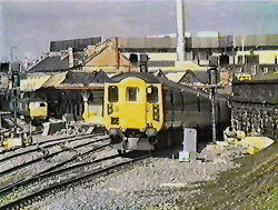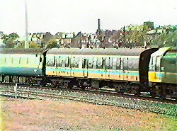| By the mid 1980s many of the Class 101 DMUs had received the blue grey livery - just as it was being replaced with the new InterCity and ScotRail liveries on other coaching stock. The stock on many trains at the time was in mixed liveries as evidenced on the Glasgow bound train of mixed livery Mk 3 stock headed by a Mk 2 DVT. The train departed from Platform 4 while track laying and platform realignment was underway. The new embankment had been planted with daffodils - VIDEO and VIDEO CAPTURES Malcolm McCrow | |||||