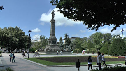 | beyond the fountains the Sovietesque city hall and modern DSK Bank building compete for attention with the more traditional architecture - VIDEO CAPTURES Malcolm McCrow | |||