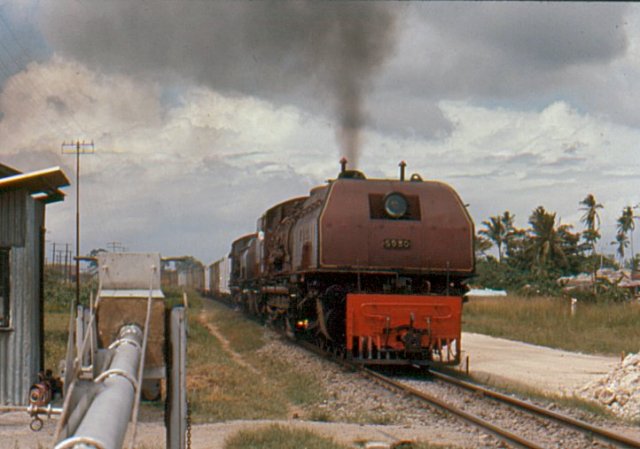 | Miritini arrival - an unidentified 59 Class with furnace flame clearly visible at the head of a freight. The visible flames below all the Garratts was quite normal. - PHOTO Kevin Patience | |||