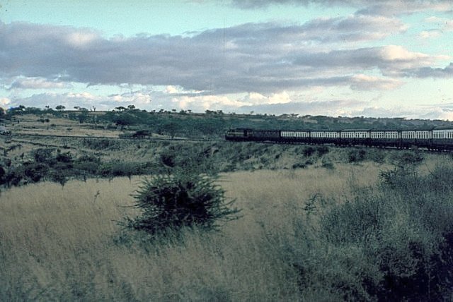 | Late running Mail Train between Voi and Mombasa. The train had been long delayed at Voi when the train engine failed and a 59 was taken off a following freight. For a while the train appeared to be double headed as the failed train engine was towed with its train until it was taken off somewhere between Voi and Mombasa - PHOTO Malcolm McCrow | |||
