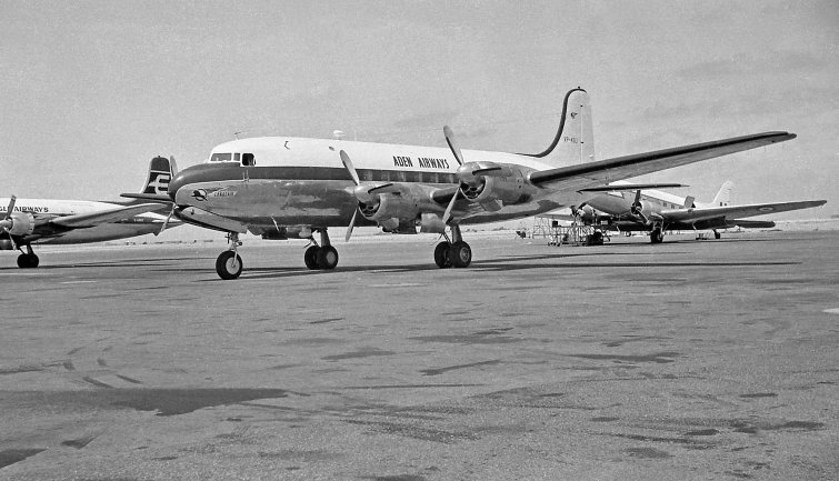 | The white tail fin and the Kenyan Registraion - VP-KOJ - (formerly G-ALHM) on East African Airways Canadair on charter to Aden Airways seen at Khormaksar accompanied by an RAF C47B Dakota and a British Eagle Airways DC6B. The Argonaut retains the East African Airways Flying Lion on the tail fin and on the nose and Aden Airways is printed in the East African Airways font. Whether or not the aircarft was ever purchased by Aden Airways is not known, but, according to "East African - an Airline Story" by Peter J Davis, it was sold by East African Airways to Britair (EA) Ltd and restored eventually to G-ALHM before being broken up at Redhill in 1966 The aircraft was broken up at Redhill in England in 1966. PHOTO Ray Deacon | ||