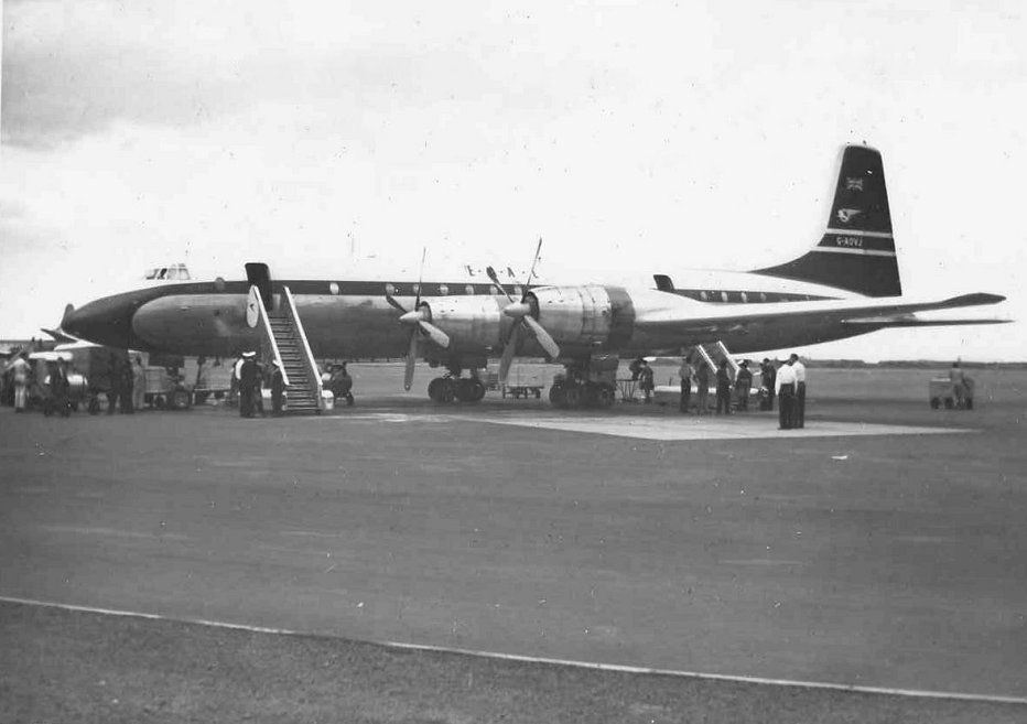 | A very rare photograph of an East African Airways Britannia 312 G-AOVJ on charter from BOAC seen at Nairobi Embakasi. In the late 1950s BOAC operated 312s to Nairobi but by 1960-61 had replaced them with the smaller 102. PHOTO Janet Davis | ||