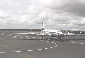 BOAC's daily Argonaut Flight BA 161 taxies in on its inboard engines during 1958 (left). Prior to 1958, the tail fin would have been white, and during 1958 the Argonaut was withdrawn by BOAC and replaced by the Britannia. An RAF Transport Command Comet 2E is parked on the apron (right). PHOTOS - Ron Bullock |