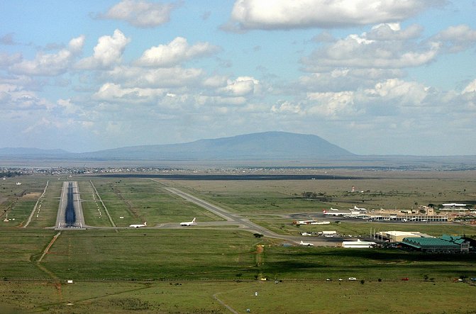 On finals for Rwy 06 on 14 November 2004. Air Mauritius A319 and Air India A310 is holding short. The terminal is now the right, but the runway is still the original built at Embakasi in 1957-8. Ol Donyo Sabuk dominates the skyline to the east. PHOTO - Hannes Meyer |