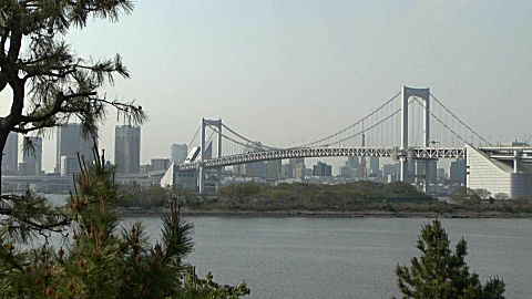 Tokyo's rather smaller Statue of Liberty (left) was a gift from Paris. The rainbow Bridge (right) was opened in 1993 - VIDEO CAPTUREs Malcolm McCrow |