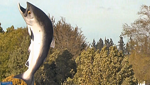 | The Rakaia River is crossed by the longest, if less than spectacular, road and railway bridges in New Zealand. After crossing the river Rakaia town's twelve metre salmon statue can be seen on the right hand side of the road - PHOTOs Malcolm McCrow | |