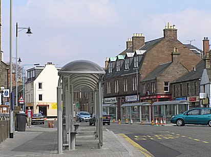 | East High Street (left) The new pavement was re-aligned in 2005 and projects out into the road. The new street lamps have been made to look old which makes the futuristic bus shelters in East High Street (left) look, perhaps, somewhat incongruous. Coutties Wynd leading down to Academy Street (right) - PHOTOs © Malcolm McCrow | |