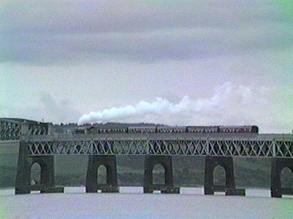 | The special train's arrival from Perth in the morning signalled the start of the celebrations. That evening it departed for Edinburgh and is seen (right) coming off the Tay Bridge at Wormit. VIDEO ORIGINAL and CAPTURES - Malcolm McCrow Just off the picture to the right was the scene of a major accident when on Saturday 28 May 1955 a special train carrying kids from a Sunday school picnic derailed on leaving the tunnel at Wormit Station; there were fatalities. | |