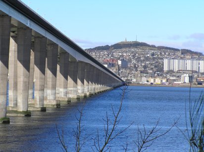 | Dundee "multies" (left) and more conventional housing (right) form a backdrop to the Road Bridge while Craigowl with its radio masts has still a dusting of snow in March 2005. PHOTOs Malcolm McCrow | |