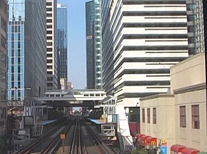 | Nothing to be seen from the tethered balloon at Navy Pier Park (left); approaching State and Lake on the L (above) - PHOTOs Malcolm McCrow | |||||