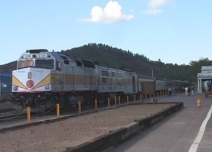 | All Aboard for Grand Canyon with the tourist Grand Canyon Railroad. A modified F54PH is on the point - PHOTOs Malcolm McCrow | |