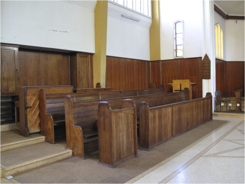 | The walls of the chapel were originally a mushroom colour and for several years only the front few rows were equipped with proper pews. The original gym has been converted into a Roman Catholic chapel and the old armoury into a mosque - PHOTOs Glen Smith | |||