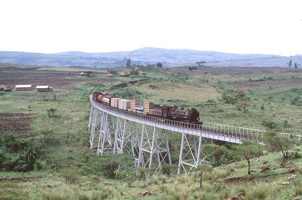 A characteristic of the Nakuru-Kisumu branch is the numerous US-style trestles along the line. 24 Class 2448 with a freight train. PHOTO - James Waite |