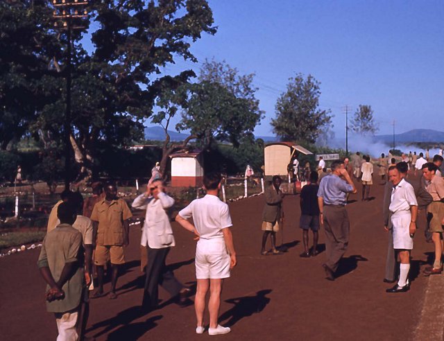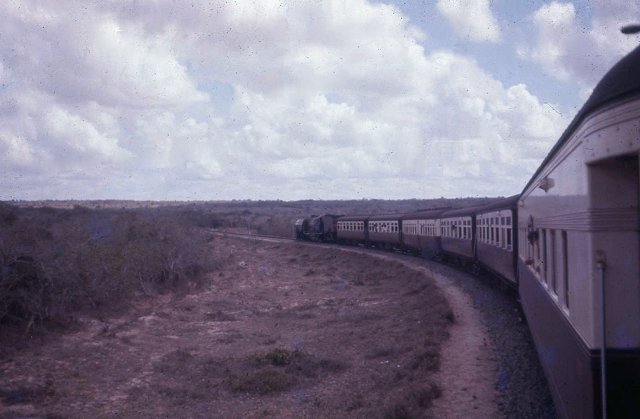 | Late running Mail Train between Voi and Mombasa. The train had been long delayed at Voi when the train engine failed and a 59 was taken off a following freight. For a while the train appeared to be double headed as the failed train engine was towed with its train until it was taken off somewhere between Voi and Mombasa - PHOTO Malcolm McCrow | |||