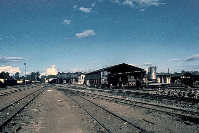 | Looking towards the steam shed, the setting sun illuminates towering cumulonimbus clouds in the darkening eastern sky. It was often possible to visit the MPD while waiting for the Mail Train - PHOTO - Peter Ritchie | |||