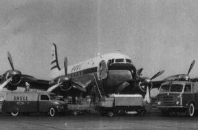 BOAC Argonaut G-ALHG Aurora(left) which crashed in Manchester after passing to British Midland. Air France Viscount 700 (right) is towed on to the ramp. |
