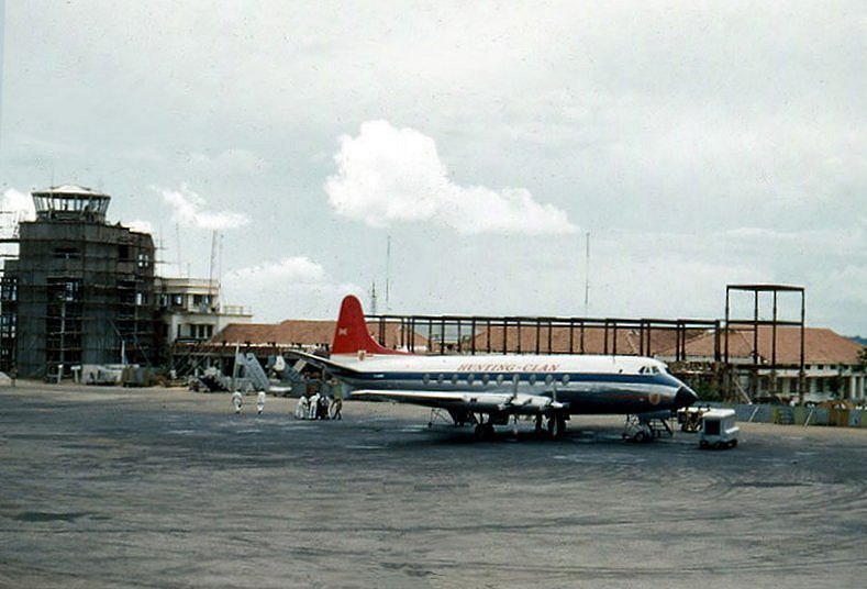 A Hunting Clan Viscount 800 transits Entebbe for either Nairobi or Salisbury during the construction of the new tower and terminal in 1958. PHOTO John James |