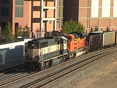 A Canadian National SD60F behind a BNSF C44-9W heads a short westbound freight. A lash-up is headed by two former Rio Grande GP40-2s and a former Southern Pacific GP40M-2 heading east with another short freight - PHOTOs Malcolm McCrow |