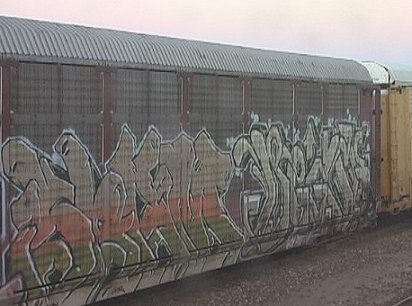 | An autorack has been targeted by the graffiti artists (left); running between a stack train and and a row of autoracks at Winslow - PHOTOs Malcolm McCrow | |